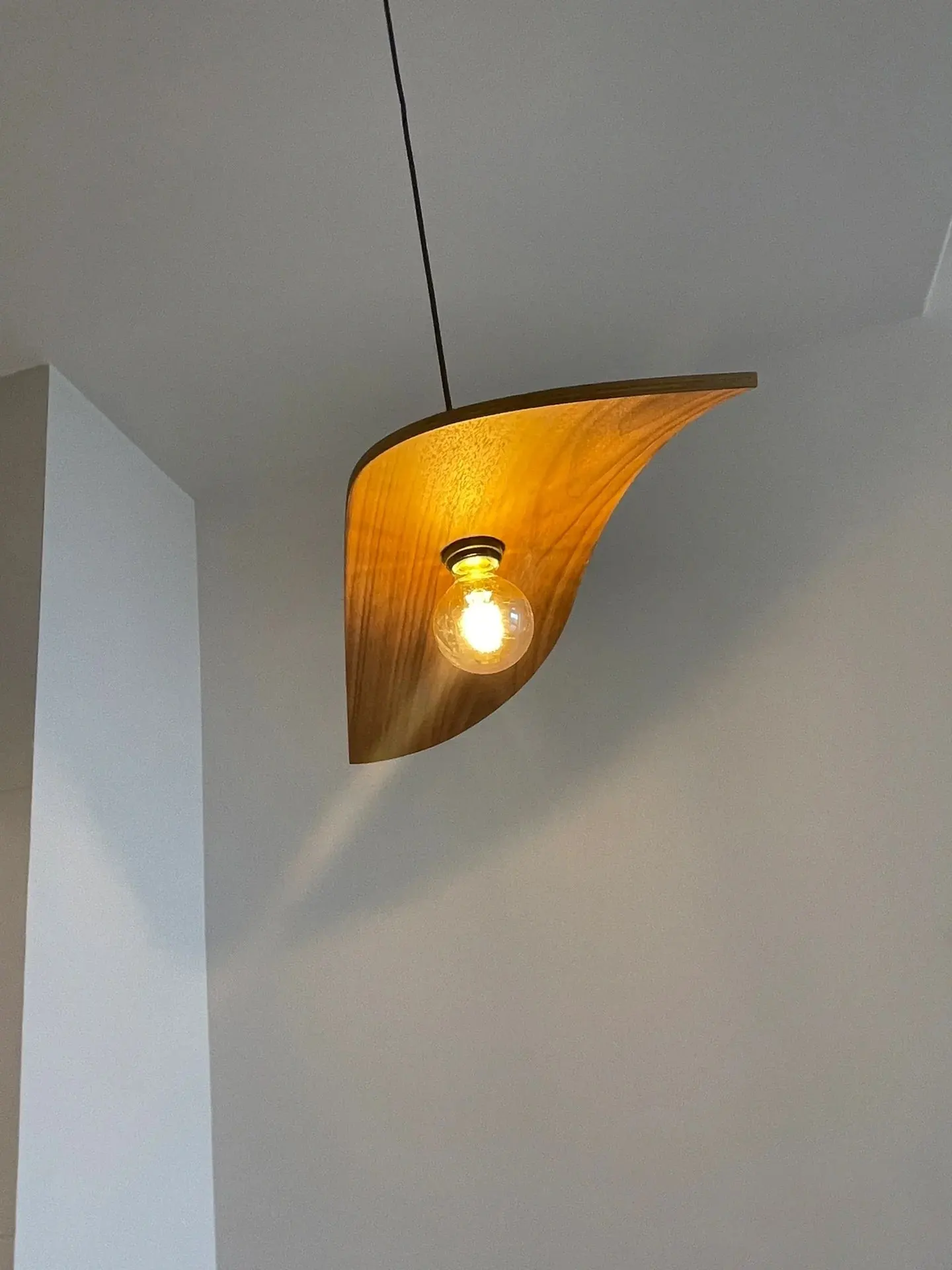 Handcrafted walnut Wabi Sabi chandelier with LED bulbs. Minimalist Japanese Zen pendant light for dining rooms, bedrooms, and modern interiors.